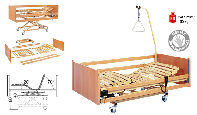Regulación electrónica de la altura de la cama con carro elevador. Regulación electrónica del respaldo y de las piernas, todo con un sencillo mando a distancia. Máximo confort: 4 planos articulados con lamas de madera.Cabezal, piecero y barandillas de madera. La cama tiene cuatro ruedas con freno y trapecio incluido.