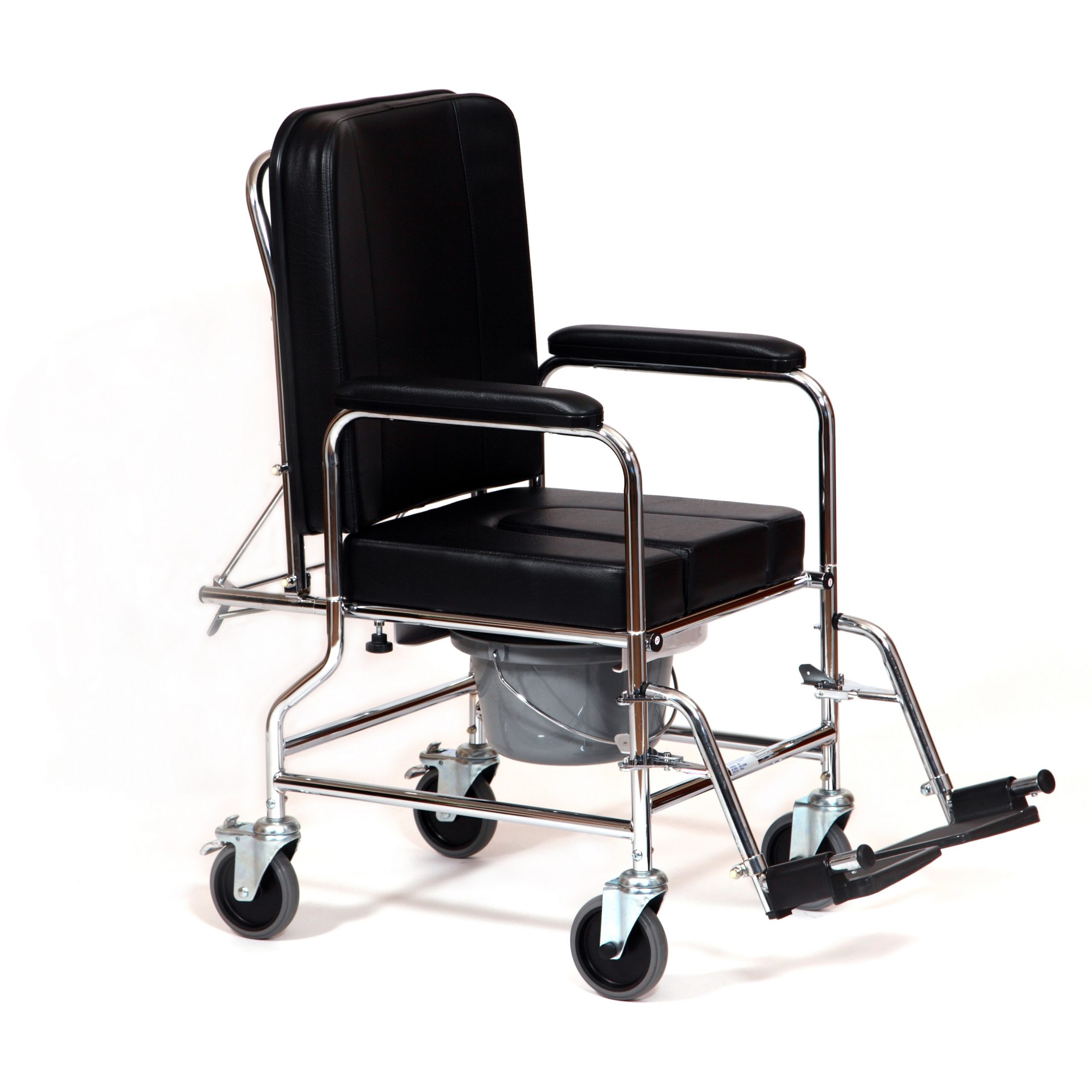 Silla de ruedas fija con respaldo reclinable hasta 160º. Estructura de acero resistente. Tapizado anatómico. Asiento inodoro con cubeta extraíble.